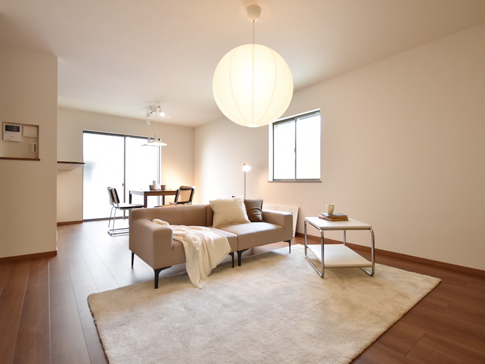 - リビングは明るい日差しが心地よく広がり、家族がゆったりと過ごせる落ち着いた空間になっています。キッチンには大容量の収納を備えており、調理器具や食材をすっきり片づけられる使い勝手の良い設計です。暮らしの中で自然に快適さを感じられる住まいです。